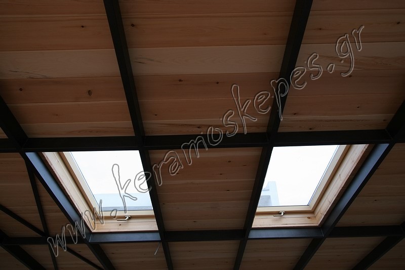 Στέγη επάνω σε μεταλλική κατασκευή με τάβλα Σουηδίας και παράθυρα οροφής